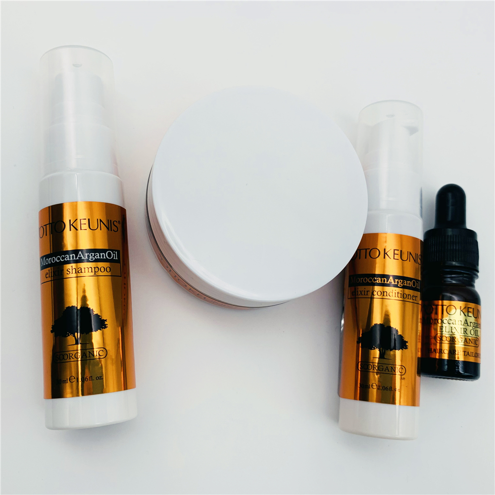 This haircare travel set includes a 30ml elixir shampoo, a 30ml elixir conditioner, a 50ml hair mask, and a 5ml hair oil, all enriched with Moroccan Argan oil, letting you enjoy a rejuvenating experience while giving your hair the care it deserves.